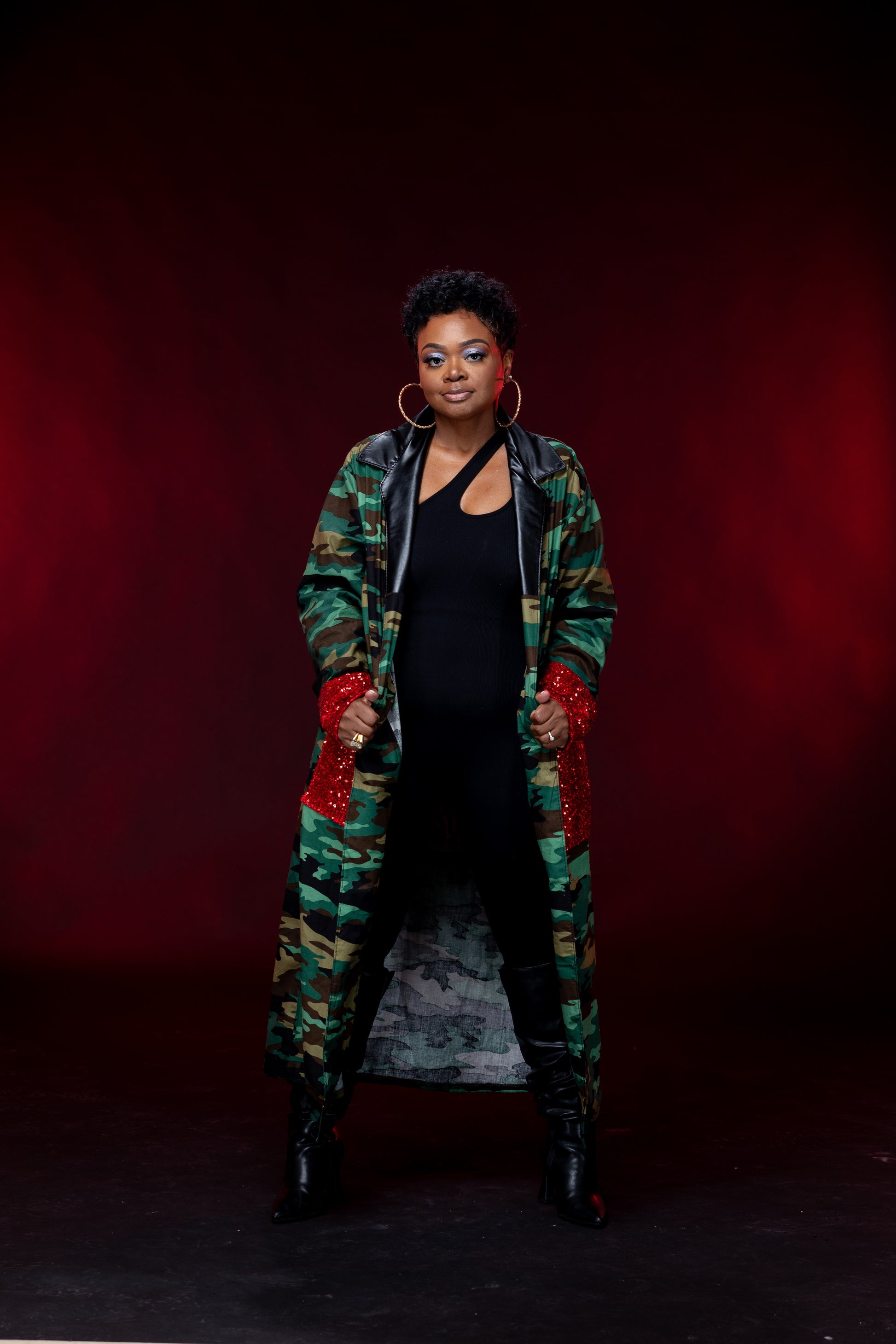 The piece blends edge with glamour, mixing military-inspired fabric with high-shine details. It’s designed to move with confidence and makes the wearer feel like the message they carry is as powerful as the outfit itself.